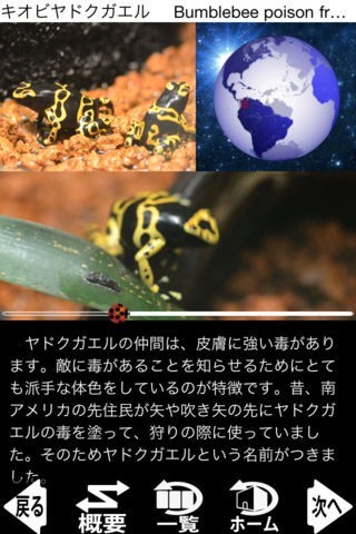 メニュー画面に表示された各動物の動画アイコンの中からお好きな動物を選んでタップしてください。説明画面に移り、動物の写真や動画と共に動物の説明が表示されます。