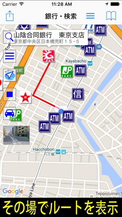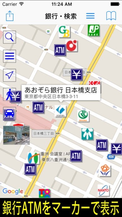 地図上に銀行のアイコンが表示されるので使いたい場所を探すのにとても役に立つ