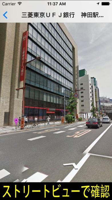 銀行のATMがある場所を地図上に表示してくれるだけではなく、銀行のアイコンなので使いたい場所を探すのにとても役に立ちます。 また、リストでは現在地からの距離が近い順に表示してくれて、インフォメーションボタンをタップすることで詳細な情報を見ることができます。 さらには、ストリートビューから実際に行くまでの風景を見ることが出来、曲がる場所の目印などといった目的地をしっかりと把握することが可能です。 加えて、キーワード検索によって、利用したい銀行名を入力することによって確実に利用できるATMを探し出すことが出来ます。