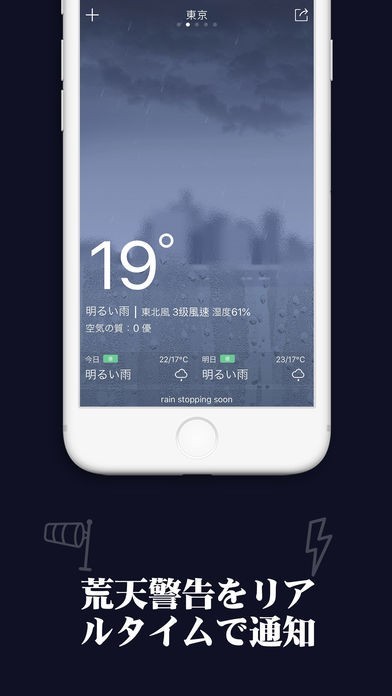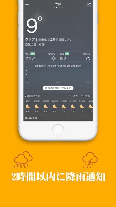 2時間以内に雨が降ると予測された場合に、プッシュ通知で知らせてくれるのでアプリを立ち上げなくても降雨情報が得られるため非常に便利です。