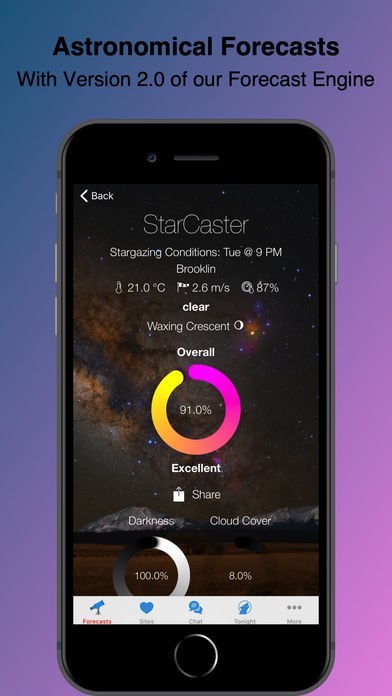 Accuracy: Tried and tested with 100's of users worldwide before our first launch - we challenge you to find a more accurate stargazing forecast app. Our custom prediction algorithms rely on multiple sources and are globally available.