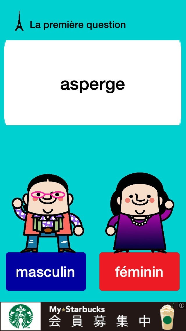 フランス語に特有の男性名詞と女性名詞、もっと判りやすく覚えたい! そんな時に役立ってくれる「フランス語単語性別クイズ」は、男性名詞と女性名詞を判りやすく学習できる便利アプリです。 ランダムに出題される10問を解いていくことで、飽きずに勉強できるのも嬉しいポイント。 冠詞と一緒に学習を進めることにより、スムーズに単語を習得することができるでしょう。 タップで答えを解答していくだけでなので通勤通学の隙間時間にも利用できる他、GameCenterとの連携により全国のユーザーと得点を競い合えるのも特徴です。
