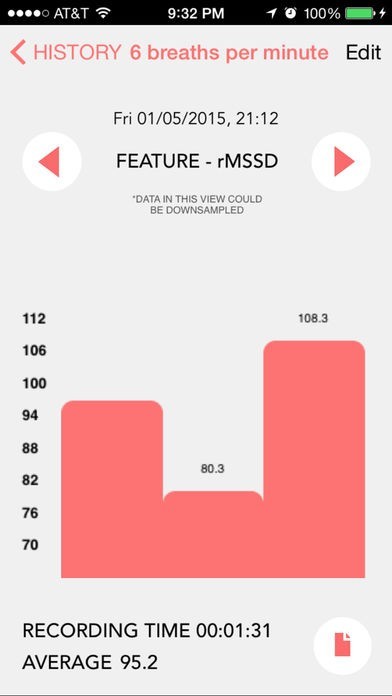 - data export/storage on iTunes and Dropbox (csv format, exports heart rates, rr intervals, events and computed features). Data export needs to be performed from the history -> recording view, by clicking on the export button (bottom left).
