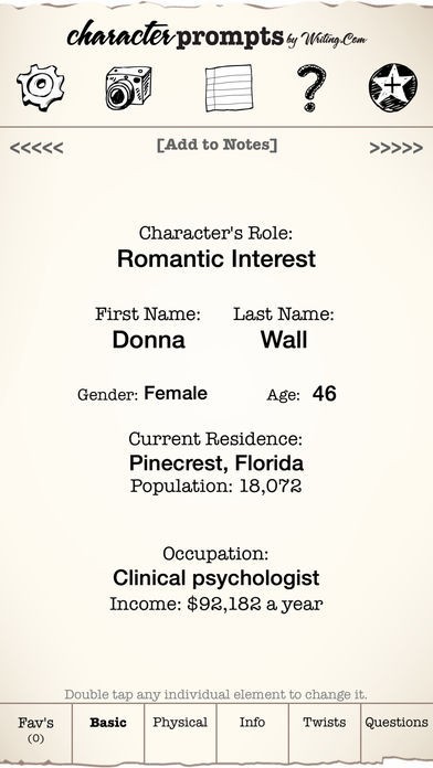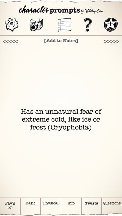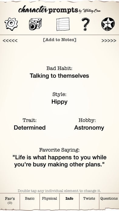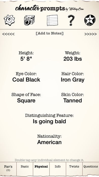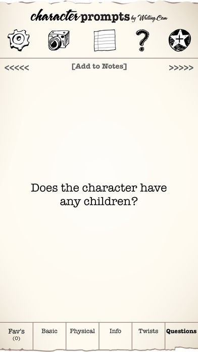 ** Five character prompt generators: Basic, Physical, Info, Twists and Questions. Store your favorite prompts into the "Fav's" tab by tapping the favorite star on any prompt.