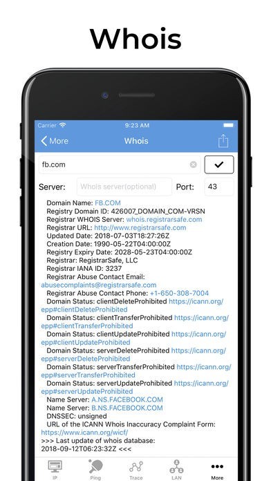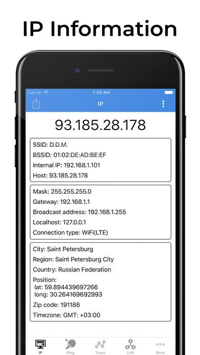 IP Tools has a simple, intuitive interface, so you can receive within seconds full information about your network, find out internal or external IP (with "My ip" feature), SSID, BSSID, broadcast address, gateway, network mask, country, region, city, the provider’s geographical coordinates (latitude and longitude), whois and other basic information.