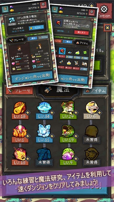 魔法などを駆使し、スライムとの激戦を繰り返し、999Fを目指すアプリです。