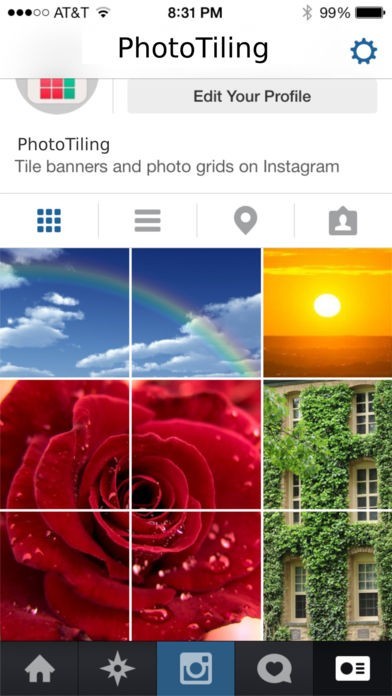 PhotoTiling is an app that enables you to crop your photos into multiple squares (tiles), then arrange them on your Instagram profile page to create Banners and Photo Grids. PhotoTiling not only enables you to easily and quickly make banners, but also provides you the maximum flexibility to tile your photos into any grid pattern you want. Besides uploading to Instagram, you can also save your Banner/PhotoGrid as a single photo.
