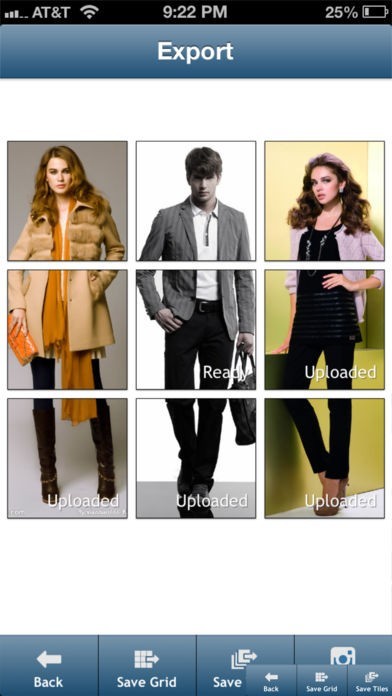 1. Load multiple photos, crop your input photos into multiple squares, then arrange and post them on Instagram as banner or any grid pattern you want. (see Screenshot 1,2,5),