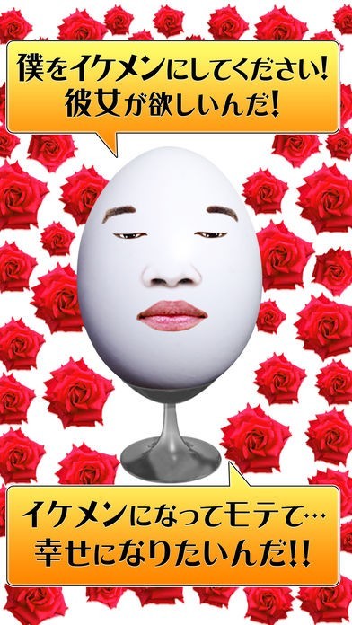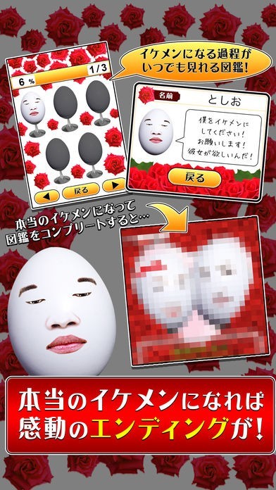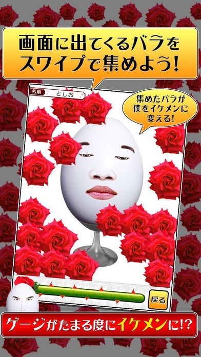 たまごのとしおをイケメンに育てるために、画面上に現れる薔薇を沢山タッチしよう。次第にイケメンに育っていく過程を見ることができるので、ゲームを続けることが楽しくなります。