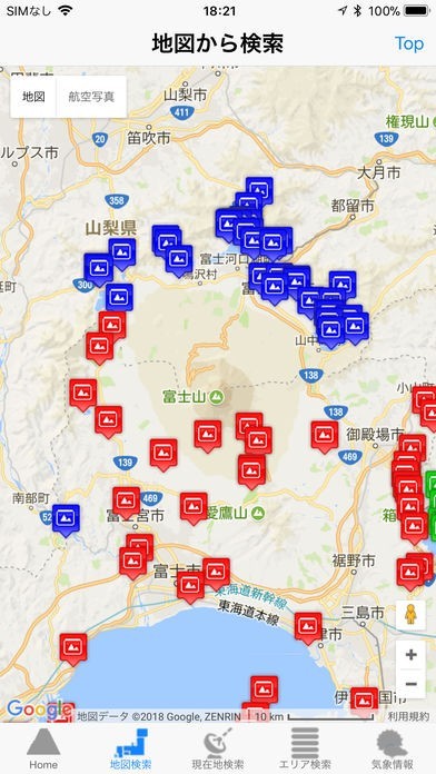 地図からビューポイントを検索します。地図上のアイコンは、「山梨県」が青、「静岡県」が赤、「神奈川県」が緑、「東京都」がオレンジ、「千葉県」が紫で表示されます。地図上のアイコンをタップすると、ビューポイント名が表示されますので、そこをタップするとビューポイント情報が表示されます。