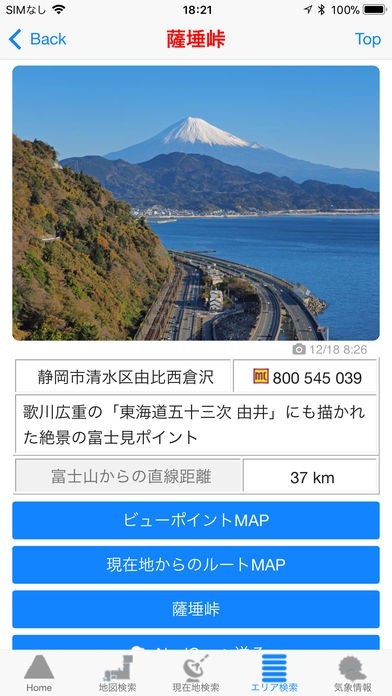 写真とともに住所、マップコード、簡単なコメントを表示します。ボタンが「ビューポイントMAP」と表示されている場合、そこをタップすると表示されている写真を実際に撮影した場所が航空写真で表示されます。また、「現在地からのルートMAP」をタップすると、地図上にルートが表示されるととともに、地図上のアイコンをタップすると、「現在地からの直線距離」と「ルート上の移動距離」が吹き出し表示されます。