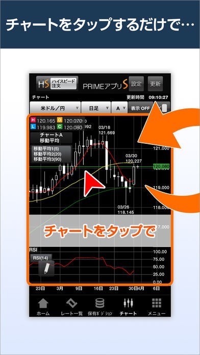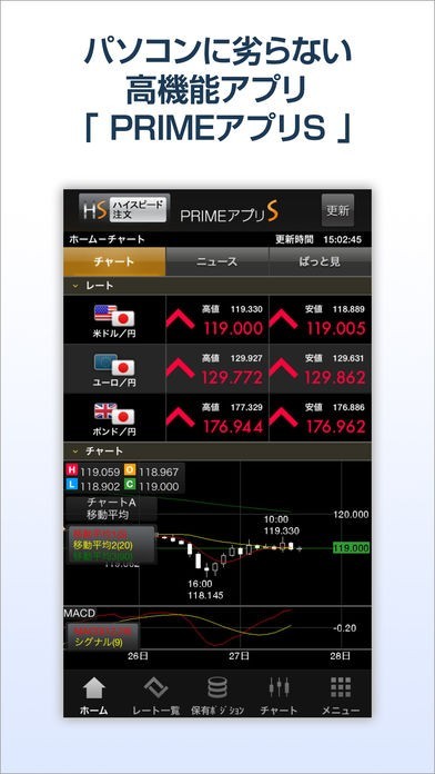 App Storeより引用「PRIMEアプリS」は場所を選ばず瞬時に取引が可能、パソコンに劣らない本格的取引ツールです。