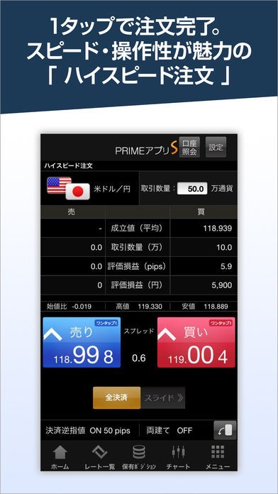 どの画面からもワンタップで、新規・決済注文が可能!通貨ペア別の全決済機能も実装。また、『選べる外貨』初実装のドテン注文も可能。