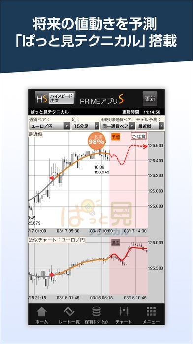 大人気の未来の相場を予測する「ぱっと見テクニカル」も搭載。ワンタップで注文できる注文機能はもちろん、入出金機能まで実装。どなたでも無料でダウンロードいただける、パソコンいらずの高機能取引ツールです。
