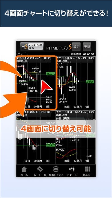画面分割表示機能(1~4画面)、トレンドライン描写・保存機能、フィボナッチ自動描写など