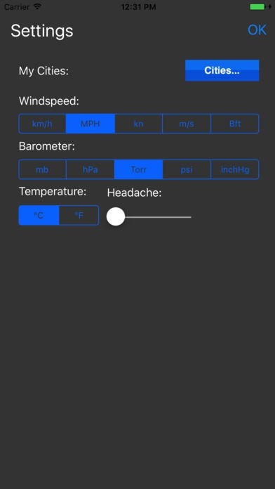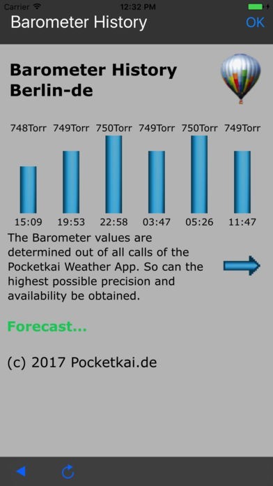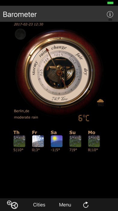 設定では気象単位を自分で設定できます。温度は°C と°Fから、風速はkm/h、MPH, kn,、ms、 Bftから、気圧はmb、hPa、 Torr、 PSI、 inHGから選べます。また、このアプリは気象情報を調べるだけでなく、アンティーク好きには嬉しい気圧計の歴史の記事も読む事ができます。