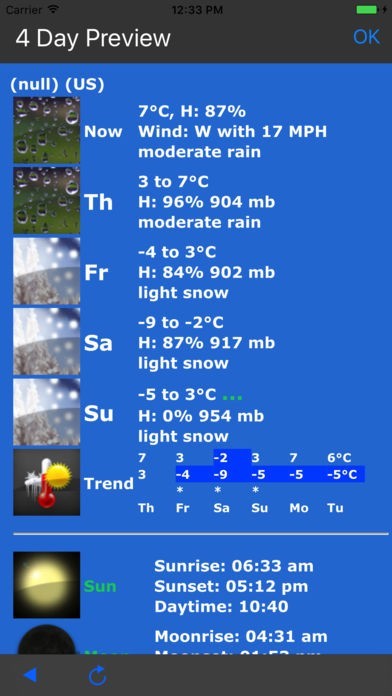 気象情報は天気、温度、湿度、風速が表示され、その日の天気だけでなく4日間分の天気情報も見る事ができます。また、日の出、日の入り、日照時間、月の出、月の入りなどもチェックできます。