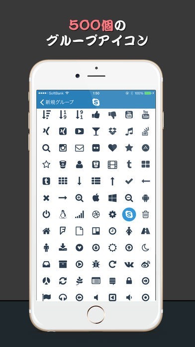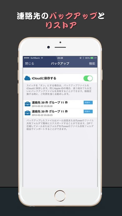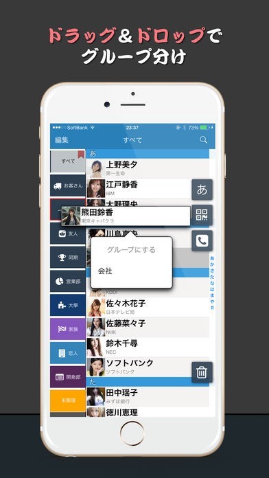 グループアイコンは500個用意されているので、それぞれのグループにぴったりのアイコンがきっと見つかります。保存した連絡先はiCloudでバックアップされるので、機種変更などの際もデータを引き継ぐことができます。