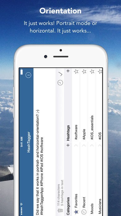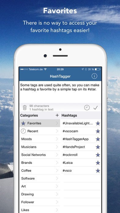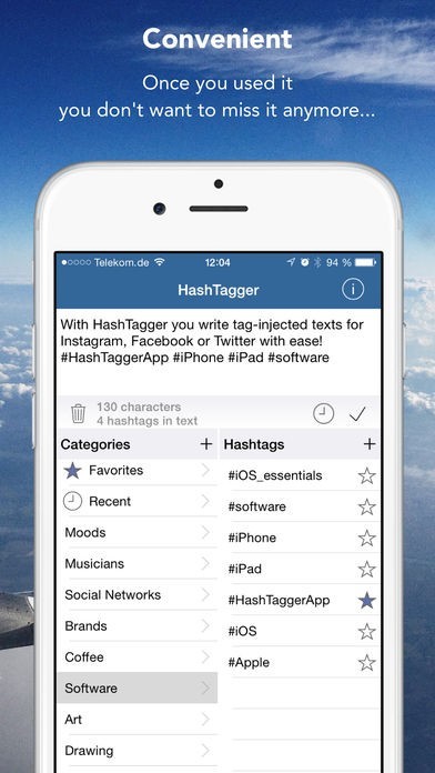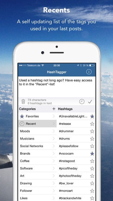 The user interface is highly optimized to provide an easy and streamlined workflow. You can edit the text freely and add hashtags from pre-defined lists with a simple tap. The lists are editable and expandable according to your needs. A „favorite“ and „recently used“ list further increase productivity. After you finalized your text, simply tap on the checkmark to copy it to the clipboard, then go to your favorite network-app and paste the text to post it.
