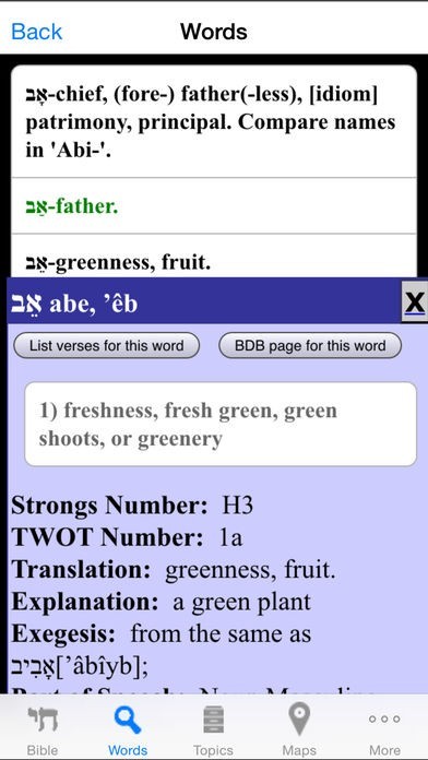 2. Words: This is useful for learning more about specific Hebrew words and for discovering related words. One can lookup words by "Root" by selecting the first two letters of the Hebrew word root. A listing will be displayed of all Hebrew words (and, optionally, Aramaic words and/or proper names) that begin with those two letters. Once the list is displayed, touching a word will open up a further level of detail about the selected word (and, optionally, all verses that contain that word or the BDB page for that word). Alternatively, one can use the "Translate" function to translate words or sentences or go directly to the word detail via the "Strongs" number lookup function. There is also a word search facility.