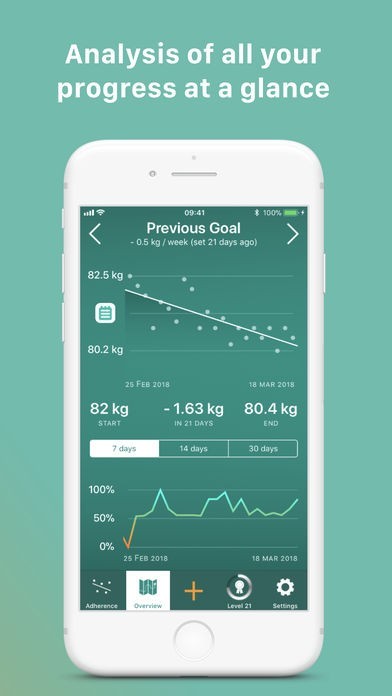 • Reach your own goal: select eg. “- 1 lb per week” (or “- 0,5kg per week” depending on your local unit) and see at a glance how good you’re doing by taking a look at your adherence percentage
