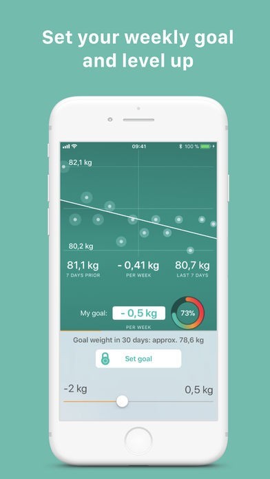 • See a graph of your goal adherence for every day since you first set your goal. Swiping on it reveals your weekly rate of weight change and how well you adhered to your goal in the 7, 14 oder 30 day average comparison on that day. There has never been anything like it before.