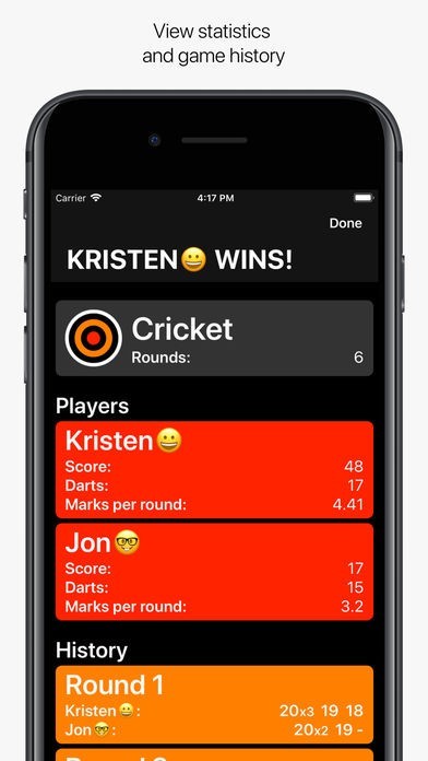 • Tap statistics button in toolbar to view statistics and what each player scored each round