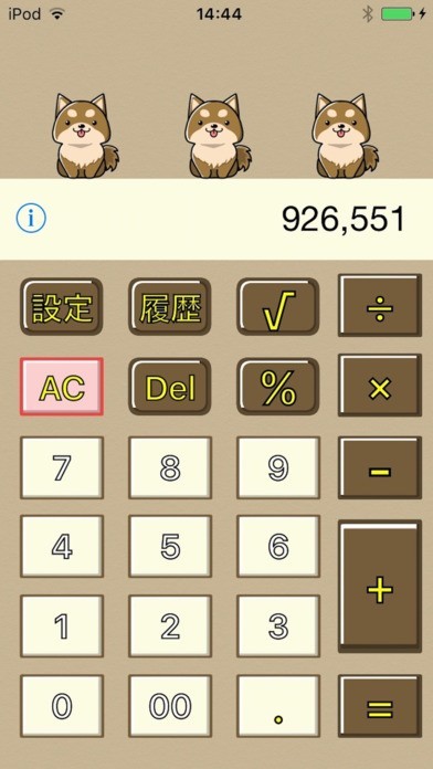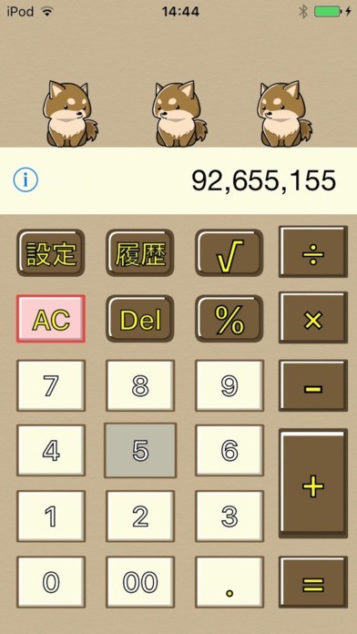 App Storeより引用柴犬が、タッチした方向に首を振るシンプルな無料の電卓です。