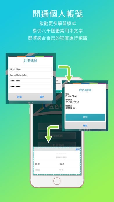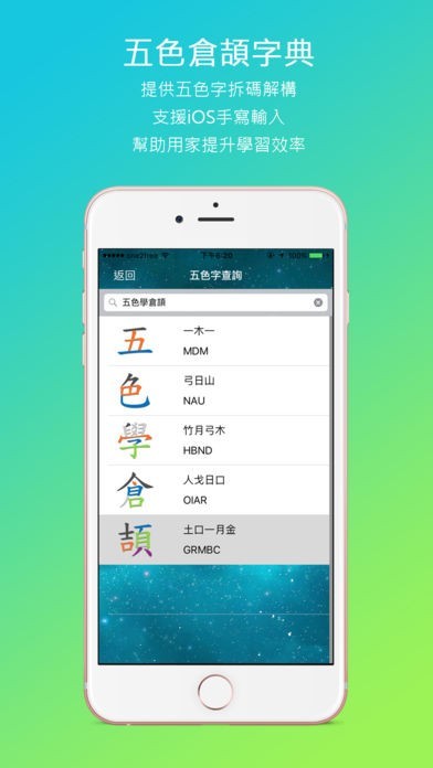 App Storeより引用《五色學倉頡 ONLINE》隆重推出,完美整合 fcjonline.com 平台,透過本軟件免費註冊一個專屬帳戶,啟用後即可提供多達六千個中文字、廿多種練習供用戶選擇。