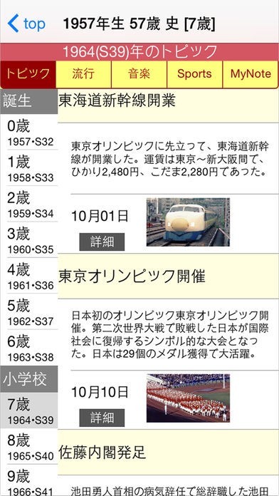 最初にトップメニューで自分の生まれ年を入力して登録しておくと、それぞれの年に自分が何歳であったかが表示されるので、より様々な出来事を身近に感じることができるようになります。