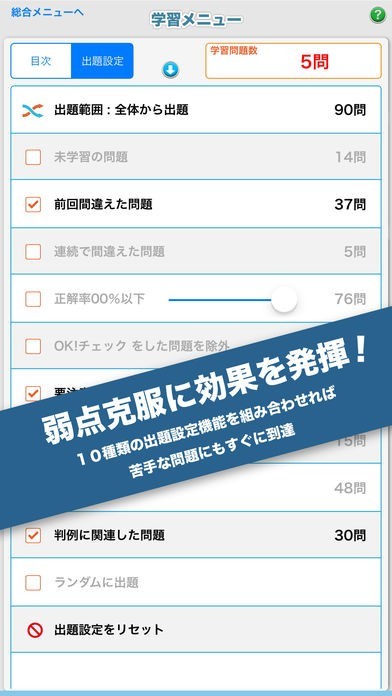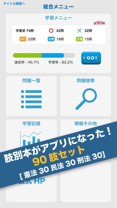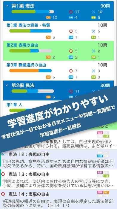 「辰已の肢別本(平成28年版)」によって、無料で司法試験のための勉強をすることが出来るようにしてくれます。 機能面では、文章を4色のハイライトと、3色の文字色によって自由自在に目立たせたり、覚えやすくしたりといった文章へと生まれ変わらせることが出来ます。 さらにはアプリ下部で、自分申告で、理解度を「OK!」、「要注意」、「不確実」の中から選ぶことが出来ることから、後で自分が苦手だと感じている部分を再学習することが出来ます。 加えて、「学習メニュー」で前回間違えた問題を集中的に学習したりも出来ます。