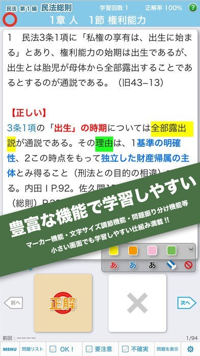 全ての問題が○×形式なので、知識が定着しているか素早くチェックすることができます。自信のない問題は△で解答することもできるので、正誤に関わらず後で復習できます。