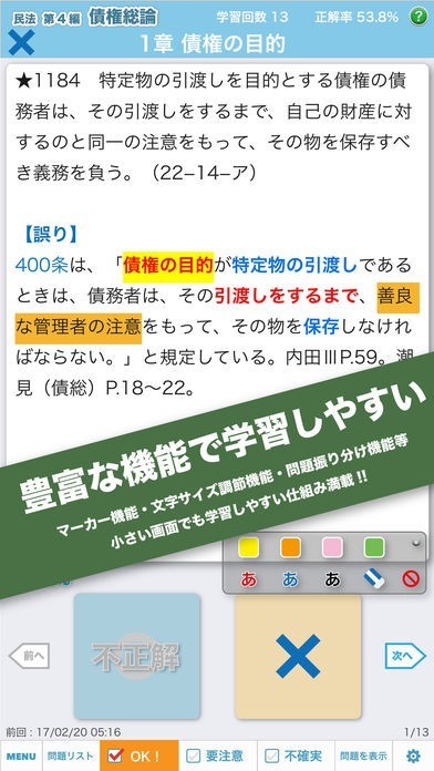 教科書がついており、最新の法令や司法についても載っています。重要度を星の数で表しているので、勉強するべきポイントがわかる。教科書上の気になる部分には、4色のマーカーで印をつけられます。