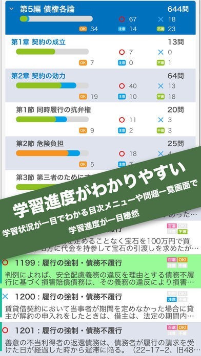 解説が豊富に用意されているので、理解度を深めながら民法の知識を高めていけます。学習状況がグラフに表示されるため、計画的に勉強も行えるでしょう。全体の正答率を確認出来るのも特徴の1つです。