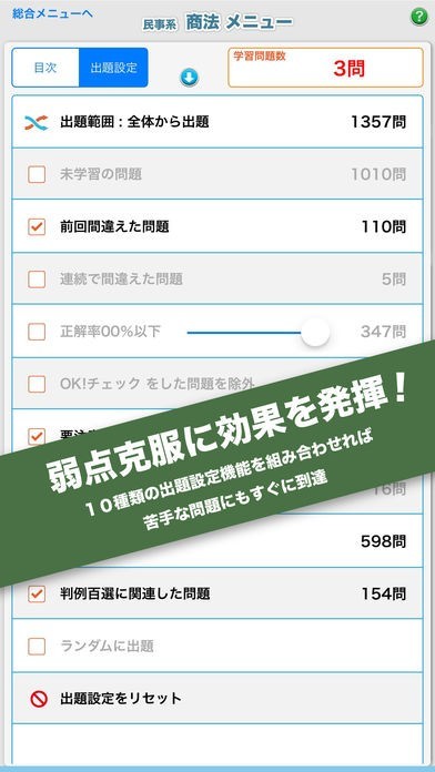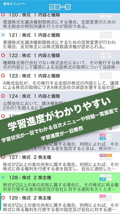 司法試験で実際に出題された短答問題や、過去の出題内容をもとにつくられたオリジナル問題など、商法に関するさまざまな問題にチャレンジすることができ、膨大な試験範囲を確実におさえられます。