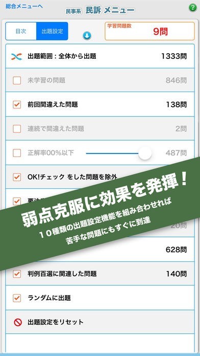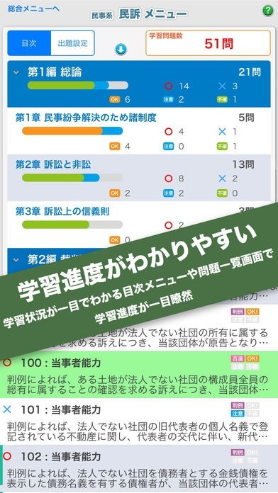 このアプリでは、民事訴訟法の問題が分野ごとに分類されています。民事訴訟法の教科書を読んで、その知識を習得できているのかをアプリを使って簡単に復習することができます。