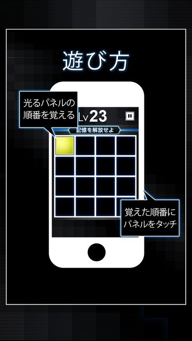 タテとヨコの4マスずつ合計16マスのパネルが表示され、それぞれのパネルが順番に光ります。プレイヤーはその順番を記憶し、後からその順番通りにパネルを押していきます。シンプルな操作でだれでも楽しめるうえ、記憶力アップにつながるという効果つきです。