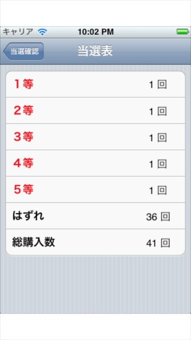 当選表ボタンにより購入履歴の各等それぞれの当選回数を表にして表示します。