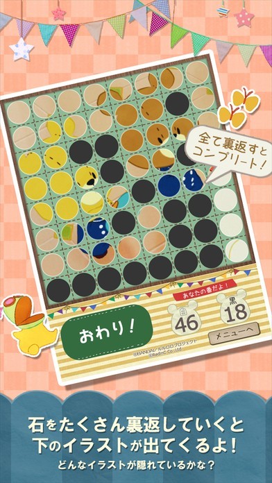 盤の石を白く裏返していくと、下に隠れているイラストが出てくるよ!