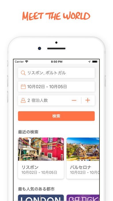 スピーク・ザ・ワールド機能搭載で、最大37か国の言語に対応しています。日本語でももちろん見られるので、使いやすいです。また都市名と日付を指定するだけで宿泊施設を探すこともできます。