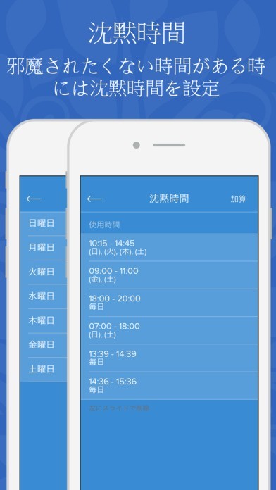 • 邪魔されたくない時用に沈黙時間を設定し保存することも可能です。