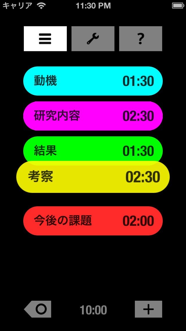 「見えるプレゼンタイマー」は、セクションごとに色分けされたリング型のタイマーでプレゼンテーション(スピーチ、ディベート、レクチャーなど)の時間配分と進行状況が、一目でパッとわかる、誰でもプレゼンの達人になれるタイマーアプリです。