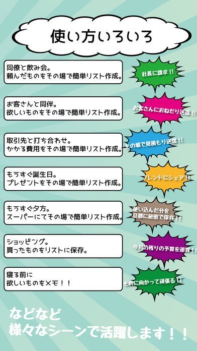 自分の欲しいものがある時に即座にリストに名前と金額を入力すれば、ほしい物の総額を把握して見積りを立てれるようになります。また、消費税自動計算をしてくれるため高額な買い物で必要な金額を正確に算出してくれます。