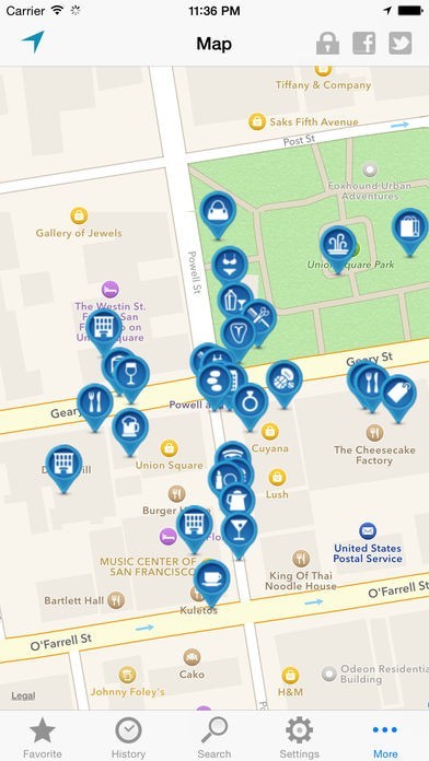 コーヒーショップやコンビニ、ガソリンスタンドまでお店の場所を地図上にピンを立ててくれるので、一目で情報が入ります。