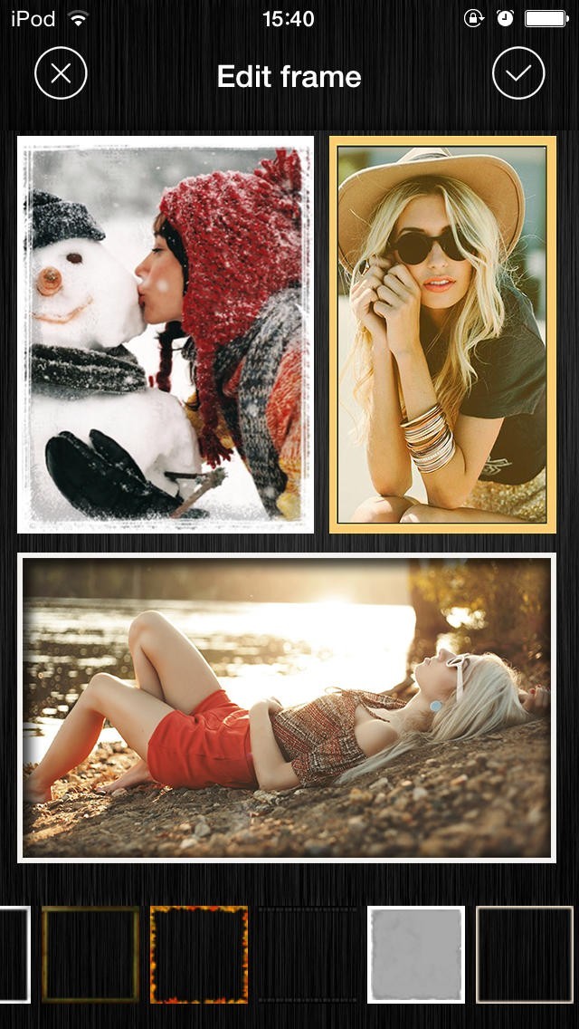 You will love the neat interface and how easily effects are created. You needn't do any cropping or adjusting. You just choose an effect or a frame, then select a photo from Camera Roll (or take a new photo with your phone camera)! ... you get a unique photo montage or collage!