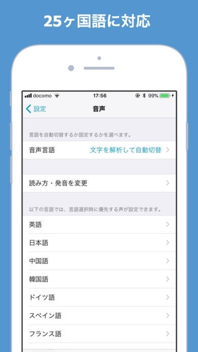 このアプリは日本語だけでなく、英語、中国語、韓国語など25か国語のテキストを読み上げることができるので、外国語のテキストを聴き、リスニング能力を養うことができます。