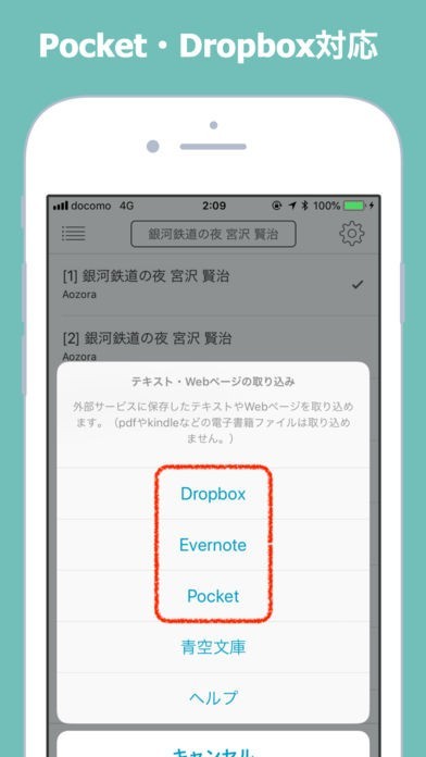 青空文庫から小説を取り込んで聴くことができる