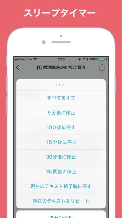 このアプリでは、テキストの音声読み上げを一定の時間が経過すると自動的に停止してくれる、「スリープタイマー」機能が搭載されているので、ベッドに横になりながら使うこともできます。