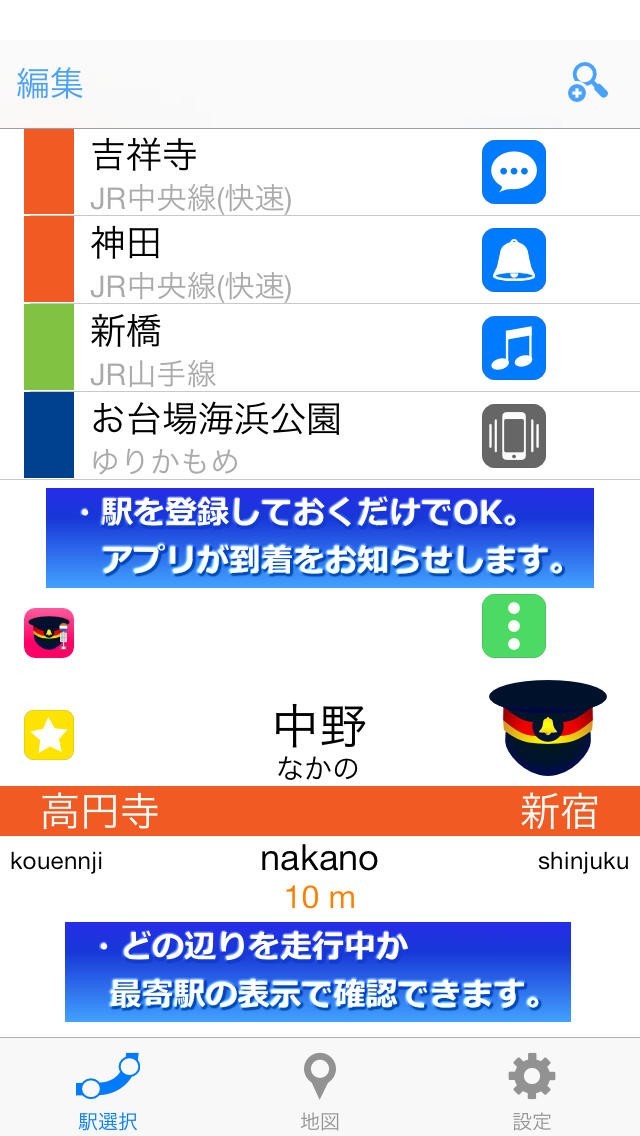 駅着いったー (電車での乗り過ごし防止に。ベルや音声などのアラームで乗り換え・目的の駅への到着をお知らせ!ルートも地図で確認!)の特徴・編集部レビュー