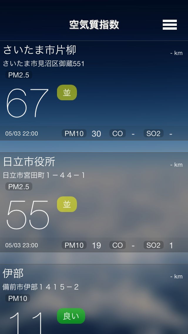 日本各地に点在している測定施設が計測した、大気汚染情報であるので気になるデータを直ぐに把握出来ます